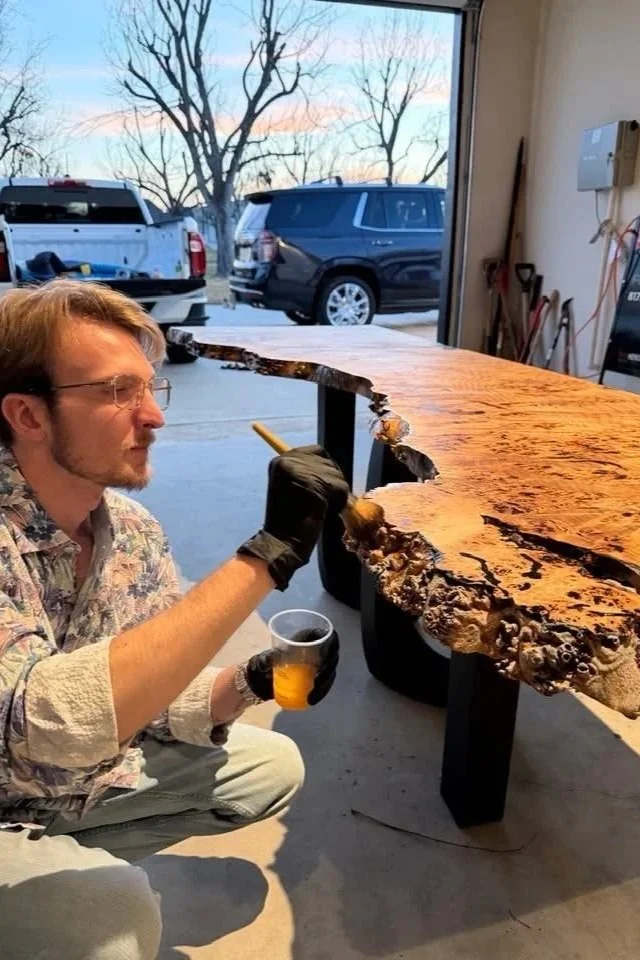 The finish was carefully worked into the live edge and epoxy-filled areas to create a smooth, durable surface while preserving the organic texture that makes the slab unique.