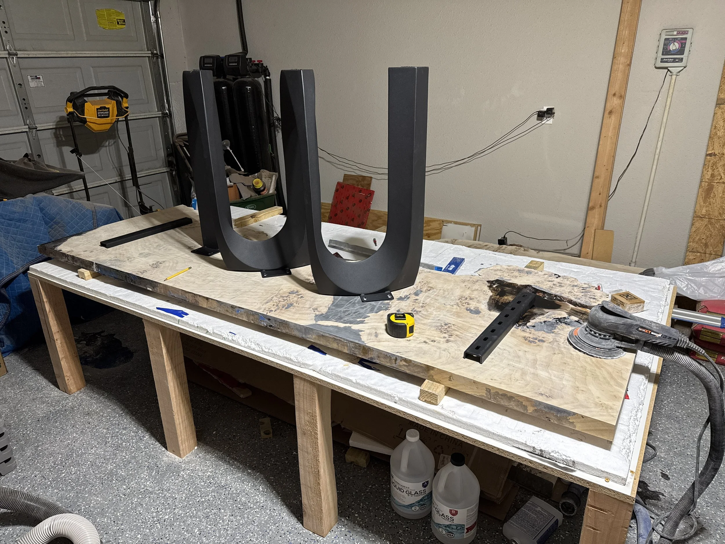 This design was driven entirely by the character of the Mappa Burl slab. The long, flowing live edge dictated the proportions, while the base was kept intentionally minimal to let the wood remain the focal point. Although I didn’t end up making the walnut wood legs in the end, we had a starting point to steer the build in the right direction. Subtle tapers, clean lines, and generous overhangs create a table that feels light and modern while still grounded and substantial.